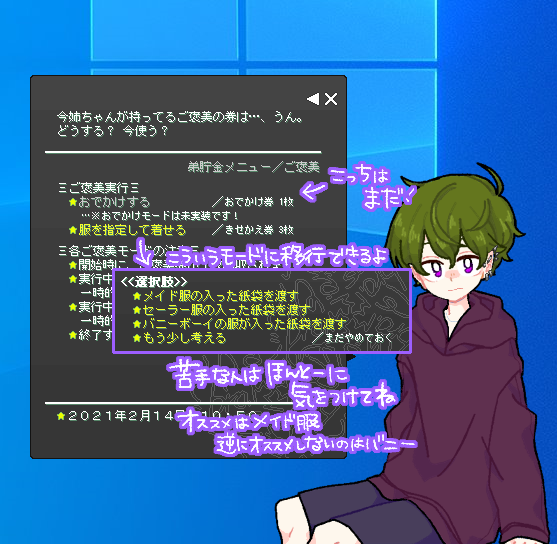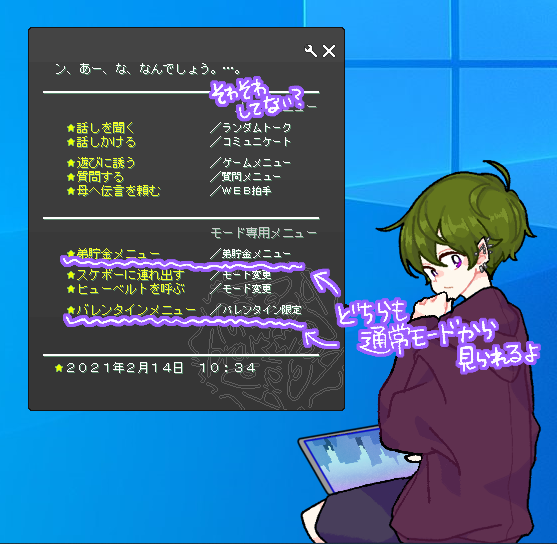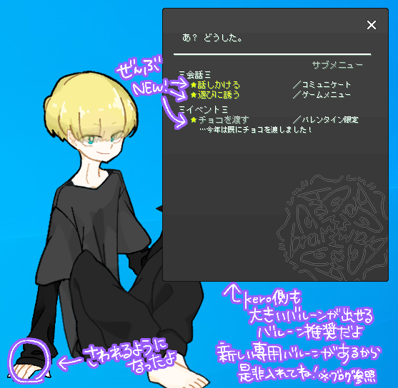 【bro.M更新】2021.1.31(Sun) bro.M_更新履歴 2021年01月31日 ●ざっくり更新内容 ・バレンタインイベント加筆修正 ・友人Hにバレンタインイベント他色々追加 ・弟貯金再実装 ・弟貯金ご褒美用モード追加(1/2) 色々追加されます。すこしおおきめのこうしん。 2年目の改修で機能を停止していた弟貯金を再実装しました。 達成するとご褒美に2つのモードどちらかを実行する権利がもらえます。 ご褒美のモードは、「かわいさ」と「格好良さ」で趣向が別ベクトルのモードを2つ用意する予定ですが、「格好良さ」の方の作業がなかなか進まないので、いったん「かわいさ」の方だけの実装になります。 新しいバルーンも良かったらチェックしてね → 追加バルーン「Bro'sWords」 エゴサ用にタグを作りました! → 「#伺か_broM」 感想やスクショなど投稿される際はタグを添えていただけると探しに行けますので是非に! 下記に詳細な更新内容が続きます。 つづきはこちら PR